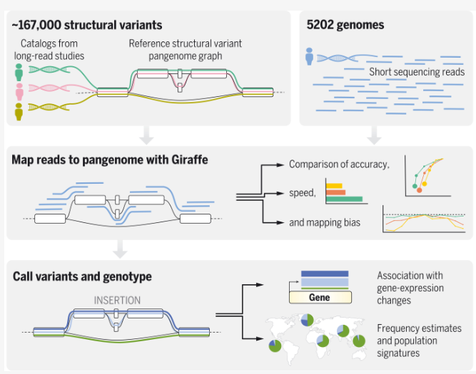 Sirén J, Monlong J, Chang X, Novak AM, Eizenga JM, Markello C, Sibbesen JA, Hickey G, Chang PC, Carroll A, Gupta N, Gabriel S, Blackwell TW, Ratan A, Taylor KD, Rich SS, Rotter JI, Haussler D, Garrison E, Paten B. Pangenomics enables genotyping of known structural variants in 5202 diverse genomes. Science. 2021 Dec 17;374(6574):abg8871. doi: 10.1126/science.abg8871. Epub 2021 Dec 17. PMID: 34914532; PMCID: PMC9365333.