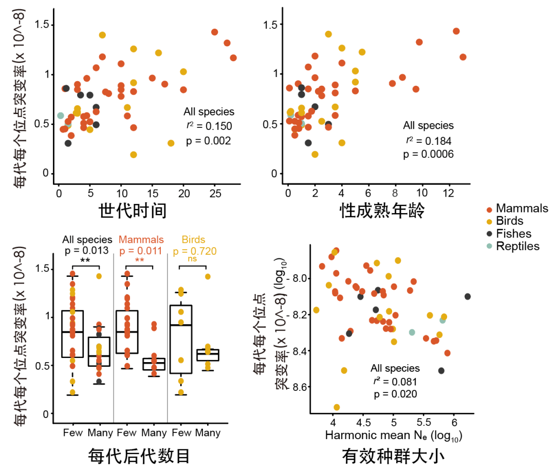 由于每代胚系突变率与每年胚系突变率为负相关关系,因此该结论支持世代时间所提出的假说。而每一代拥有更多“子嗣”的哺乳动物,其表现出较低的胚系突变率,但这一结果在鸟类中并不明显。此外,有效种群大小也是物种演化过程中的关键参数,其对自然选择和遗传漂变均产生影响。研究人员将该特征与物种胚系突变率相关联,证明当物种有效种群数目越大,每一代新突变的产生速率就越低,该结果为漂变屏障假说提供了重要证据。