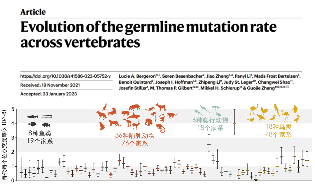 2023年3月1日,Nature在线发表了浙江大学生命演化研究中心的张国捷团队与丹麦哥本哈根大学、丹麦奥胡斯大学等国内外多家单位共同完成的题为 Evolution of the germline mutation rate across vertebrates 的论文7。研究人员对 68种脊椎动物151个家系,涵盖了36种哺乳动物、18种鸟类、8种辐鳍鱼类和6种爬行动物,共323个个体进行了高深度全基因组测序分析。并利用同一套生物信息分析策略,统一量化了脊椎动物类群中配系突变率的大小。研究发现不同物种每一代生殖细胞产生的突变率差异可达40倍。