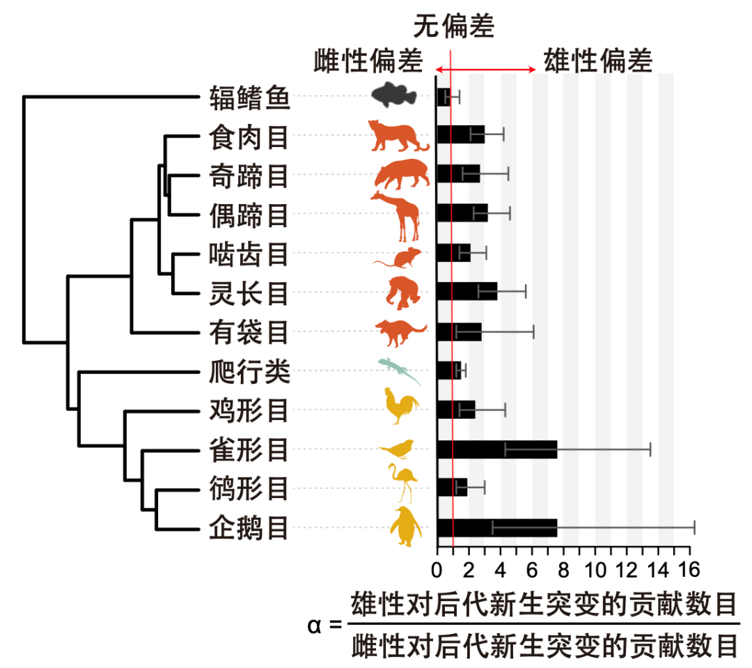 图6: 相对于鱼类和爬行类,在鸟类和哺乳动物后代的新生突变中,雄性的贡献比例远超雌性